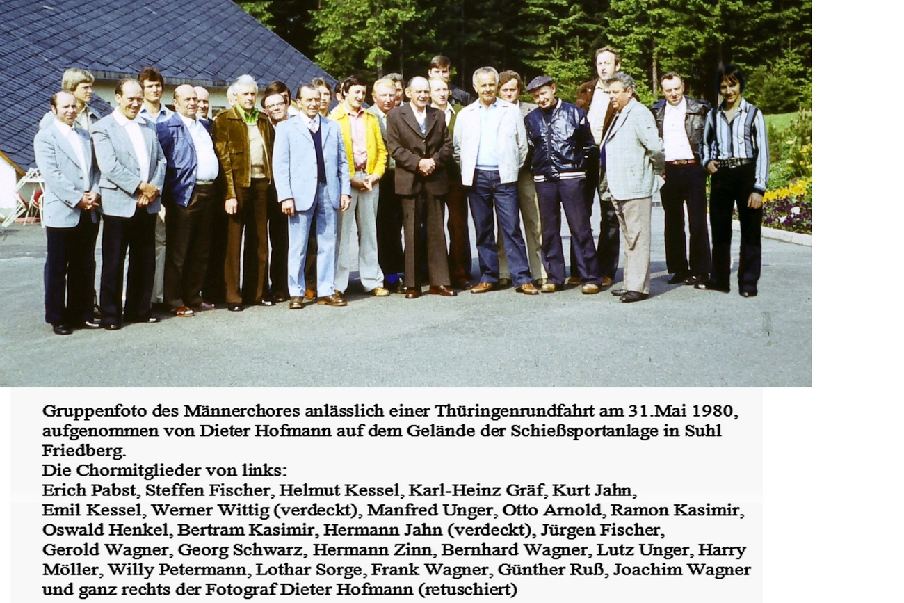 Auf dem Foto sind die Sänger (von links): Erich Pabst; Steffen Fischer; Helmut Kessel; Karl-Heinz Gräf; Kurt Jahn; Emil Kessel; Werner Wittig (verdeckt); Manfred Unger; Otto Arnold; Michael Arnold; Oswald Henkel; Bertram Kasimir; Jürgen Fischer; Hermann Jahn; Gerold Wagner; Georg Schwarz; Hermann Zinn; Bernhard Wagner; Lutz Unger; Harry Möller; Willy Petermann; Lothar Sorge; Frank Wagner; Günther Ruß; Joachim Wagner; fotographiert von Dieter Hofmann